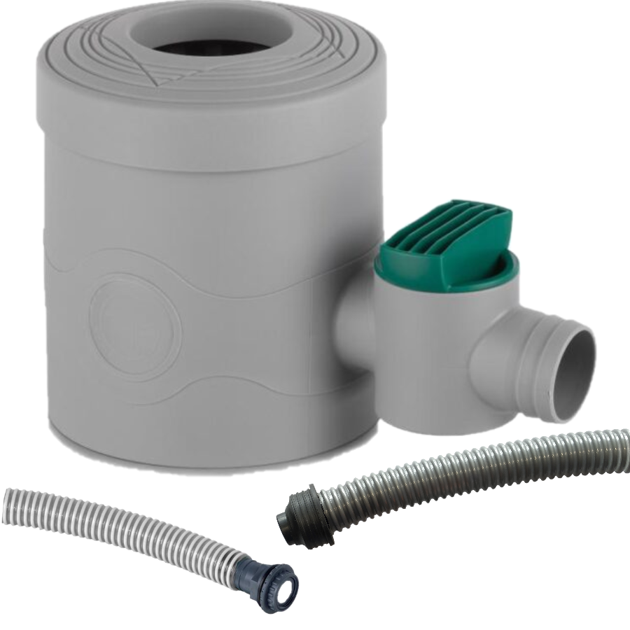 Zbieracz wody deszczowej montowany jest na rurę spustową i odpowiedzialny jest za odfiltrowanie większych zanieczyszczenia, takich jak liście i gałęzie (z powierzchni dachowych o pow około 50m2). Następnie transportuje oczyszczoną wodę (wężem ⌀32 mm) z rynny do zbiornika. Łapacz wody deszczowej przystosowany jest do montażu na prawie każdą rurę spustową – możliwość połączenia z rurami od ⌀68 mm do ⌀100 mm i z rurami prostokątnymi o wymiarach 60 x 60 mm. Dodatkowo wyposażony jest w zawór, którym możemy odciąć dopływ wody do zbiornika, np zimą.